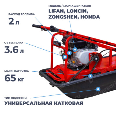 Мотобуксировщики серии 380 могут комплектоваться движками различной мощности - от среднего класса до профессионального уровня. Для регулярных дальних поездок с грузом стоит выбирать более мощный вариант, тогда как для выездов на рыбалку или охоту подойдут модели средней мощности.